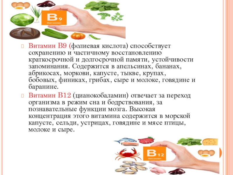 Слайд 8Витамин B9 (фолиевая кислота) способствует сохранению и частичному восстановлению краткосрочной