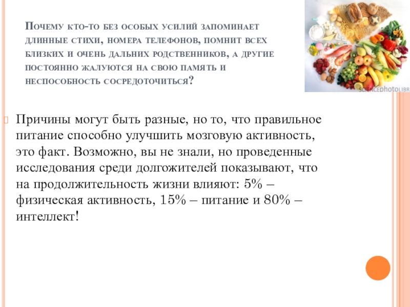 Причины могут быть разные, но то, что правильное питание способно улучшить мозговую активность, это факт. Возможно, вы не знали, но проведенные исследования среди долгожителей показывают, что на продолжительность жизни влияют: 5% – физическая активность, 15% – питание и 80% – интеллект!