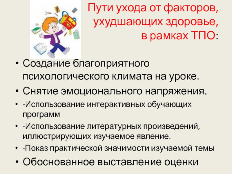 Пути ухода от факторов,  ухудшающих здоровье,  в рамках ТПО:Создание благоприятного психологического климата на уроке.Снятие эмоционального
