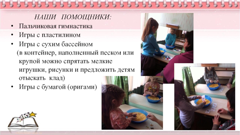 НАШИ  ПОМОЩНИКИ:Пальчиковая гимнастикаИгры с пластилиномИгры с сухим бассейном   (в контейнер, наполненный песком или крупой