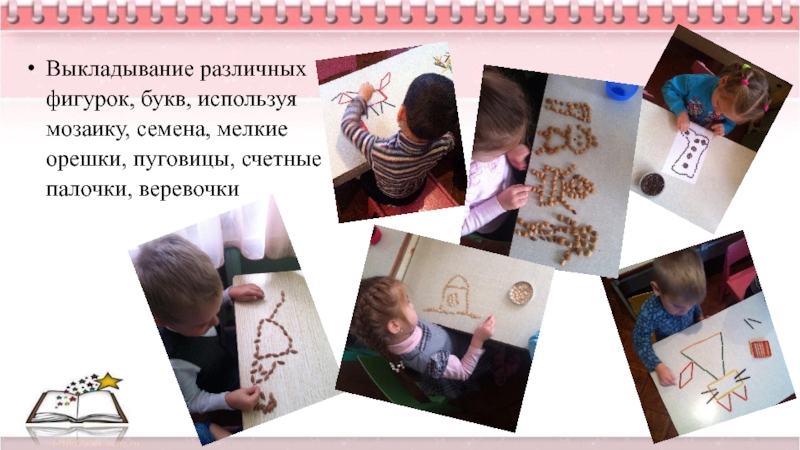 Слайд 8Выкладывание различных фигурок, букв, используя мозаику, семена, мелкие орешки, пуговицы,