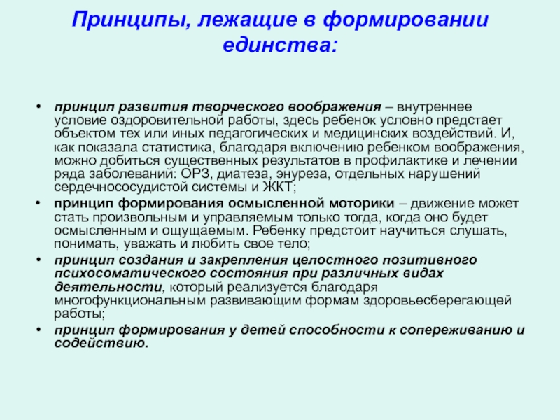 принцип создания и закрепления целостного позитивного психосоматического состояния при различных видах деятельности, который реализуется благодаря многофункциональным развивающим формам здоровьесберегающей работы;