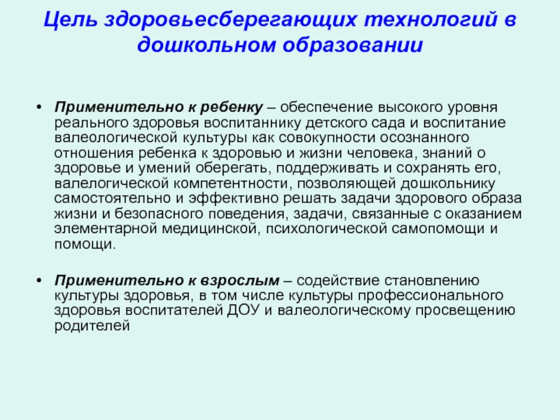 Применительно к взрослым – содействие становлению культуры здоровья, в том числе культуры профессионального здоровья воспитателей ДОУ и валеологическому просвещению родителей