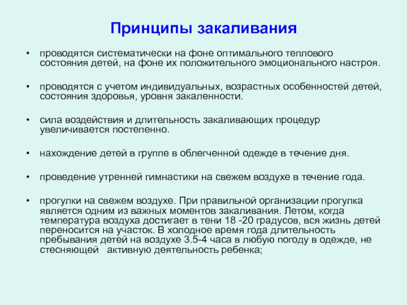прогулки на свежем воздухе. При правильной организации прогулка является одним из важных моментов закаливания. Летом, когда температура воздуха достигает в тени 18 -20 градусов, вся жизнь детей переносится на участок. В холодное время года длительность пребывания детей на воздухе 3.5-4 часа в любую погоду в одежде, не стесняющей активную деятельность ребенка;