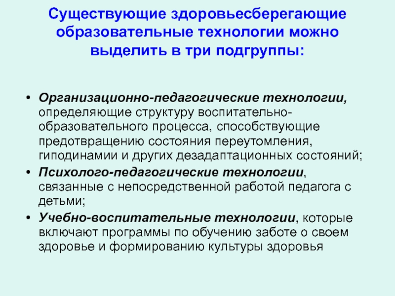 Существующие здоровьесберегающие образовательные технологии можно выделить в три подгруппы: