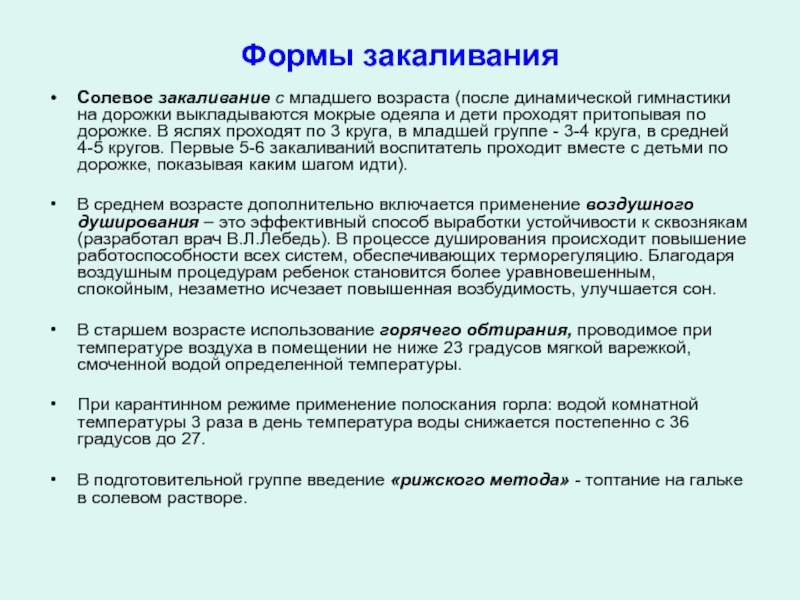 В среднем возрасте дополнительно включается применение воздушного душирования – это эффективный способ выработки устойчивости к сквознякам (разработал врач В.Л.Лебедь). В процессе душирования происходит повышение работоспособности всех систем, обеспечивающих терморегуляцию. Благодаря воздушным процедурам ребенок становится более уравновешенным, спокойным, незаметно исчезает повышенная возбудимость, улучшается сон.
