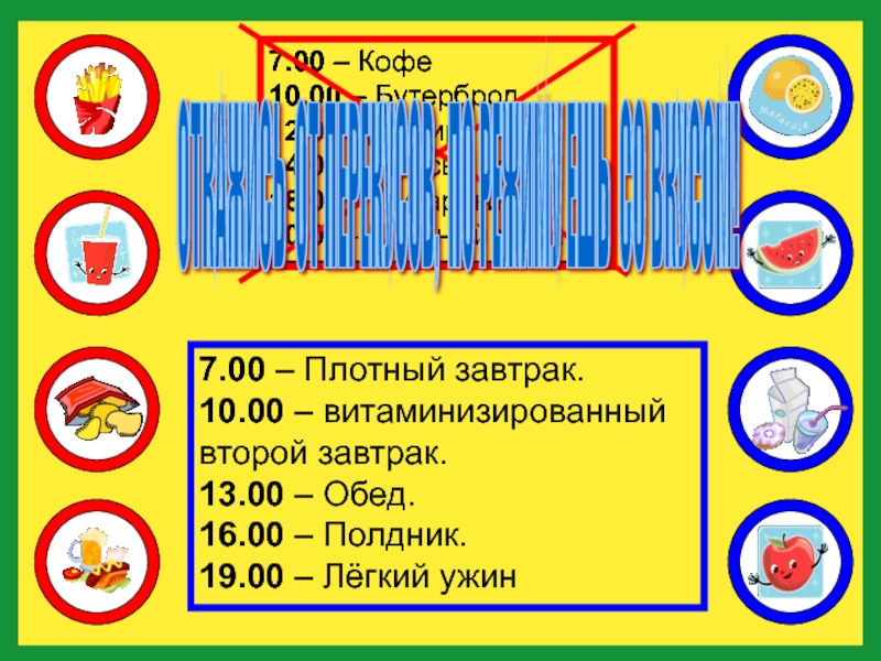 7.00 – Кофе 10.00 – Бутерброд 12.00 - Доширак 14.00 – Чипсы, Кола 18.00 – Сухарики 20.00 - Плотный ужин.