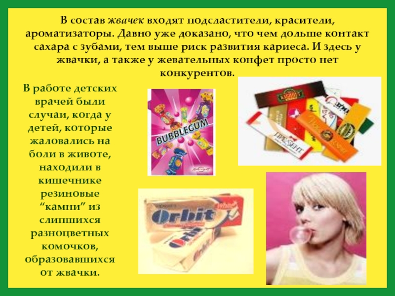 В работе детских врачей были случаи, когда у детей, которые жаловались на боли в животе, находили в кишечнике резиновые “камни” из слипшихся разноцветных комочков, образовавшихся от жвачки.