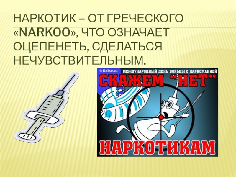 Слайд 24НАРКОТИК – от греческого «narkoo», что означает оцепенеть, сделаться нечувствительным.
