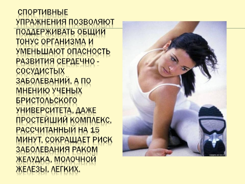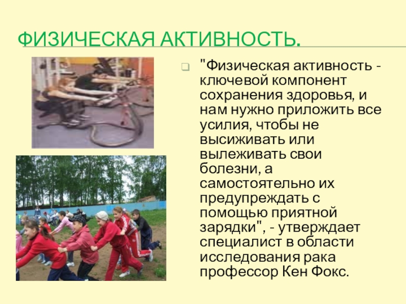 болезни, а самостоятельно их предупреждать с помощью приятной зарядки", - утверждает специалист в области исследования рака профессор Кен Фокс.