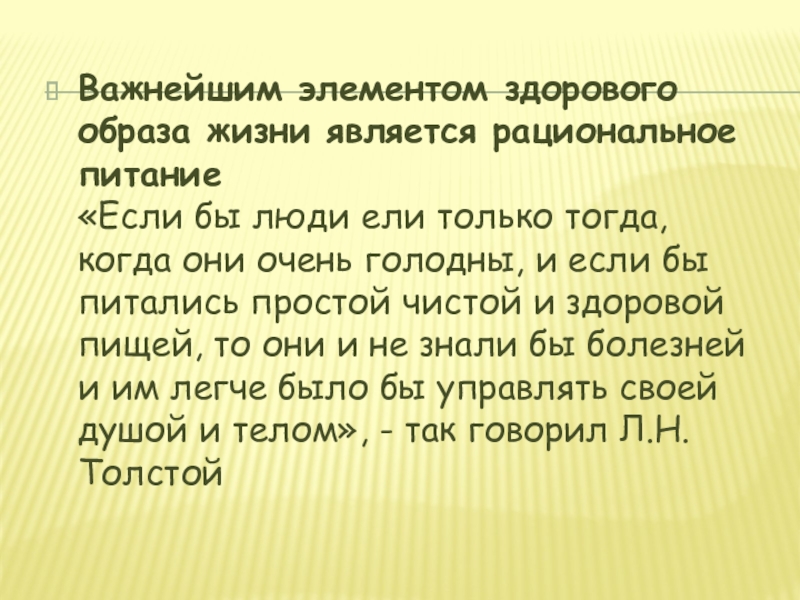 питались простой чистой и здоровой пищей, то они и не знали бы болезней и им легче было бы управлять своей душой и телом», - так говорил Л.Н. Толстой