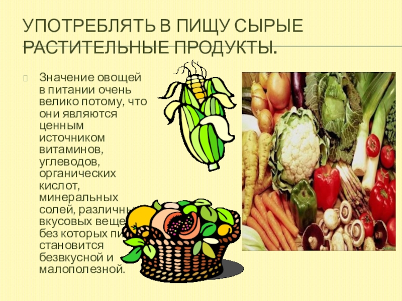 Слайд 6Употреблять в пищу сырые растительные продукты.
