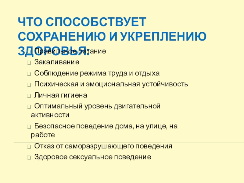 Слайд 3Что способствует сохранению и укреплению здоровья: