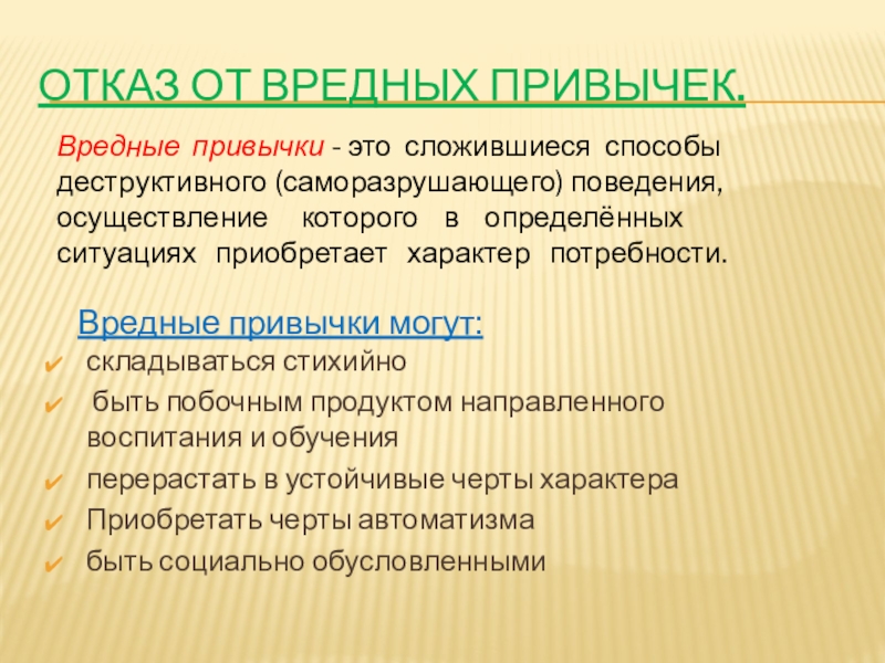 привычки - это сложившиеся способы деструктивного (саморазрушающего) поведения, осуществление которого в определённых ситуациях приобретает характер потребности.