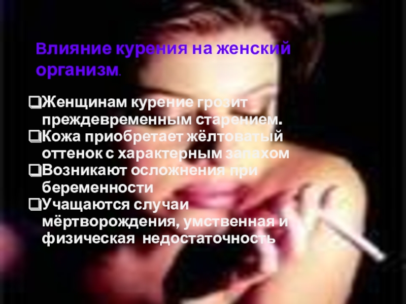 Слайд 18Влияние курения на женский организм.