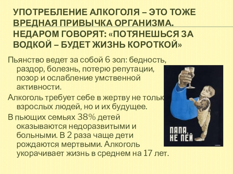Слайд 19Употребление алкоголя – это тоже вредная привычка организма. Недаром говорят: