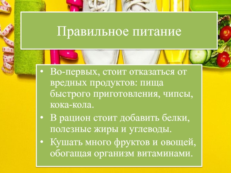 Правильное питание Во-первых, стоит отказаться от вредных продуктов: пища быстрого приготовления, чипсы, кока-кола.В рацион стоит добавить белки,