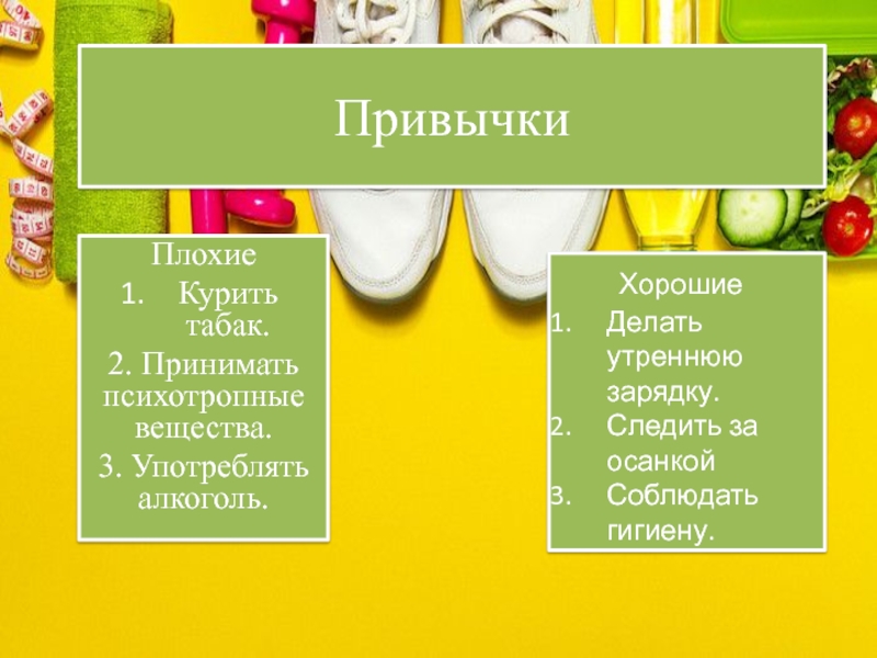 Привычки Плохие Курить табак.2. Принимать психотропные вещества.3. Употреблять алкоголь.    Хорошие Делать утреннюю зарядку.Следить за