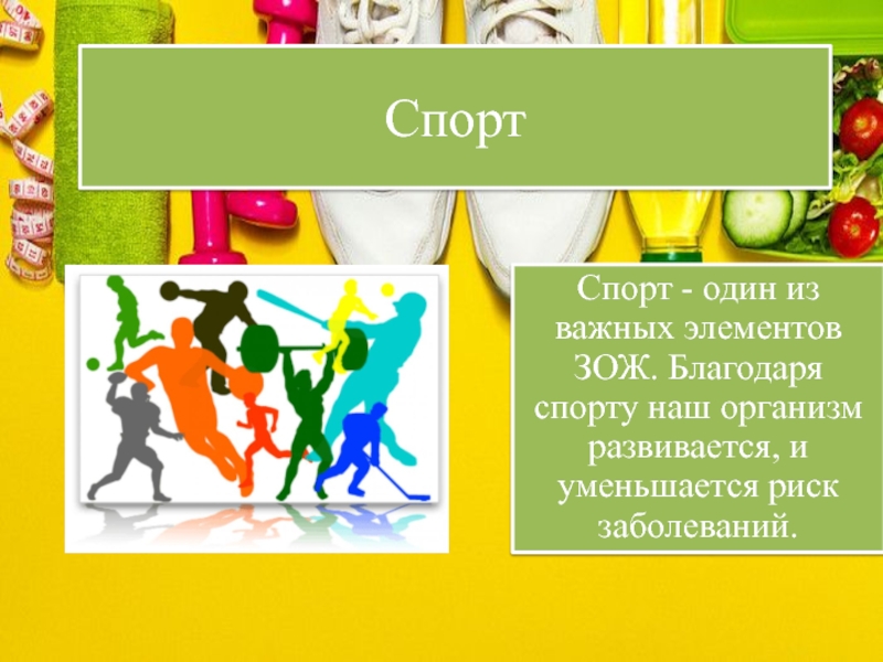 Спорт Спорт - один из важных элементов ЗОЖ. Благодаря спорту наш организм развивается, и уменьшается риск заболеваний.