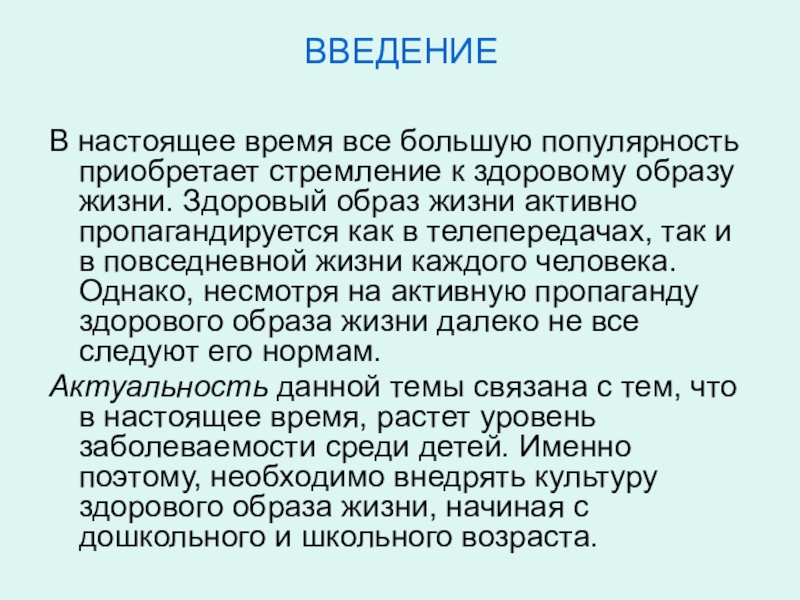 так и в повседневной жизни каждого человека. Однако, несмотря на активную пропаганду здорового образа жизни далеко не все следуют его нормам.Актуальность данной темы связана с тем, что в настоящее время, растет уровень заболеваемости среди детей. Именно поэтому, необходимо внедрять культуру здорового образа жизни, начиная с дошкольного и школьного возраста.