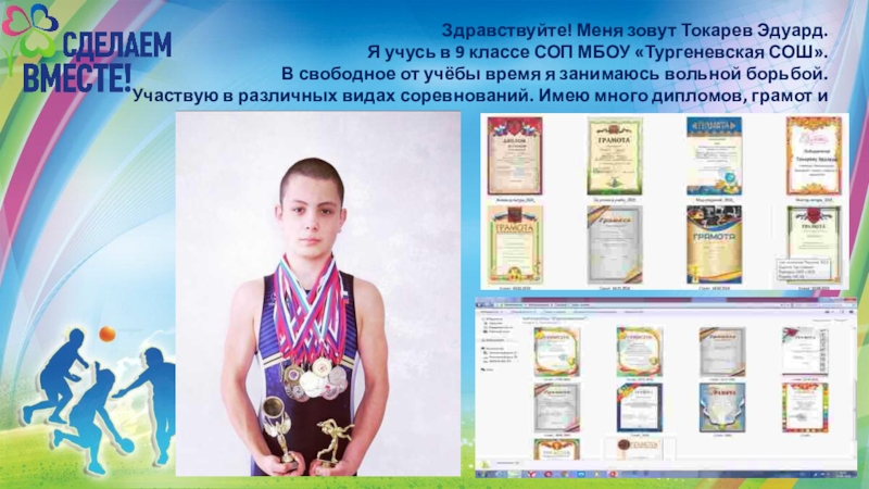 Здравствуйте! Меня зовут Токарев Эдуард. Я учусь в 9 классе СОП МБОУ «Тургеневская СОШ».В свободное от учёбы время я занимаюсь вольной борьбой. Участвую в различных видах соревнований. Имею много дипломов, грамот