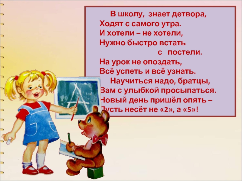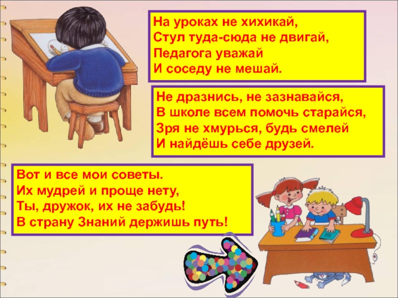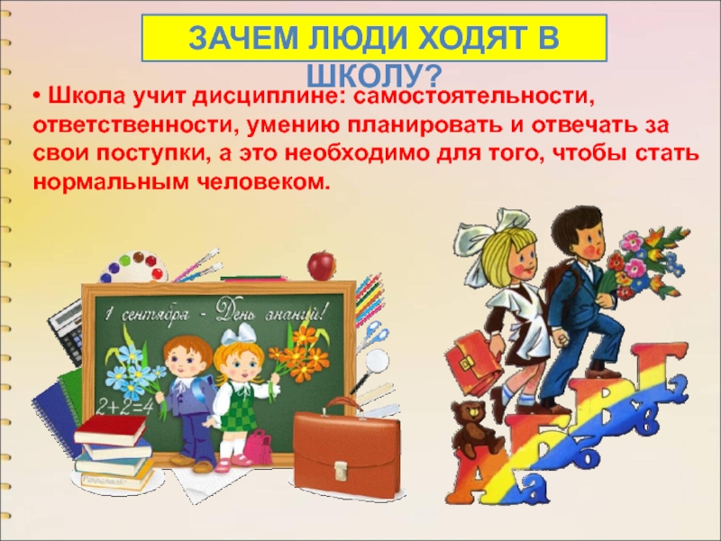 Слайд 5• В школу ходят, чтобы получать знания, без которых невозможно