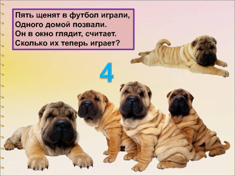 Слайд 37Пять щенят в футбол играли,