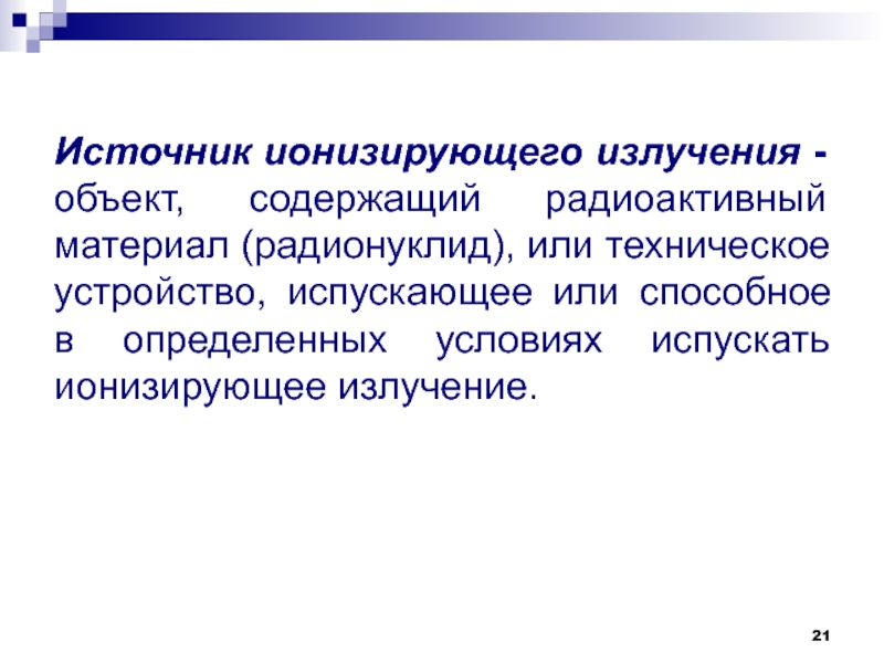 Слайд 21Источник ионизирующего излучения - объект, содержащий радиоактивный материал (радионуклид), или