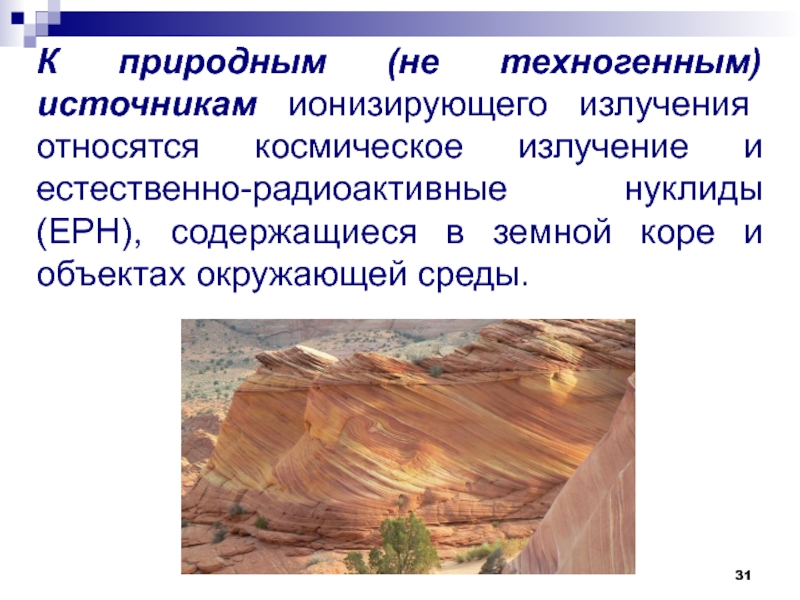 Слайд 31К природным (не техногенным) источникам ионизирующего излучения относятся космическое излучение