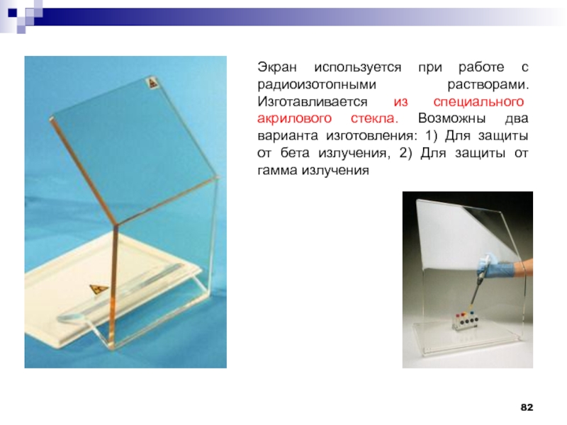 Слайд 82Экран используется при работе с радиоизотопными растворами. Изготавливается из специального