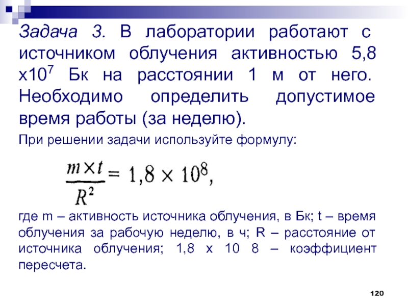 Слайд 120Задача 3. В лаборатории работают с источником облучения активностью 5,8х107