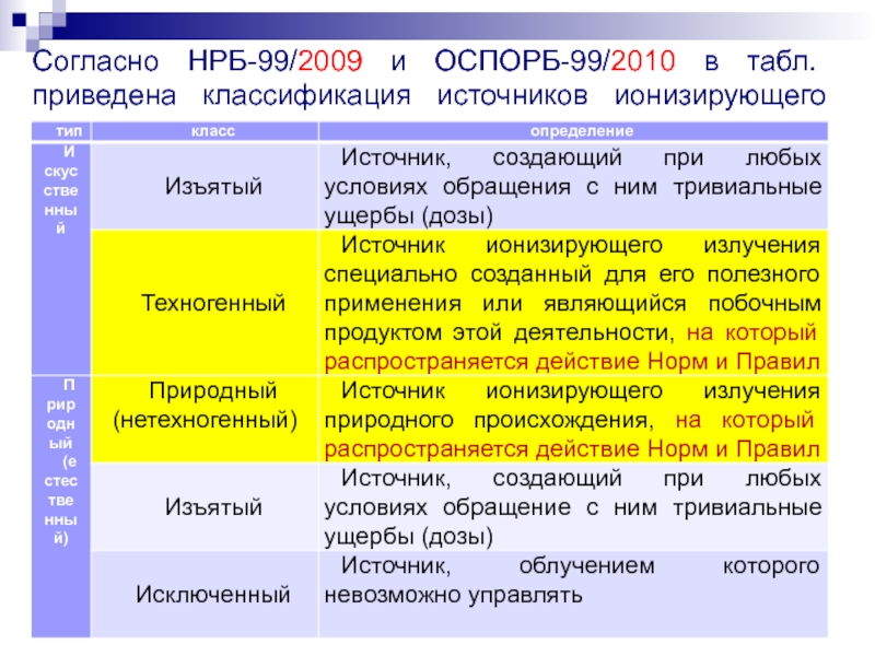 Слайд 24Согласно НРБ-99/2009 и ОСПОРБ-99/2010 в табл. приведена классификация источников ионизирующего