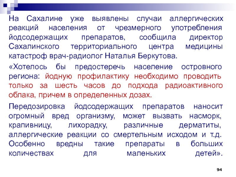 Слайд 94На Сахалине уже выявлены случаи аллергических реакций населения от чрезмерного