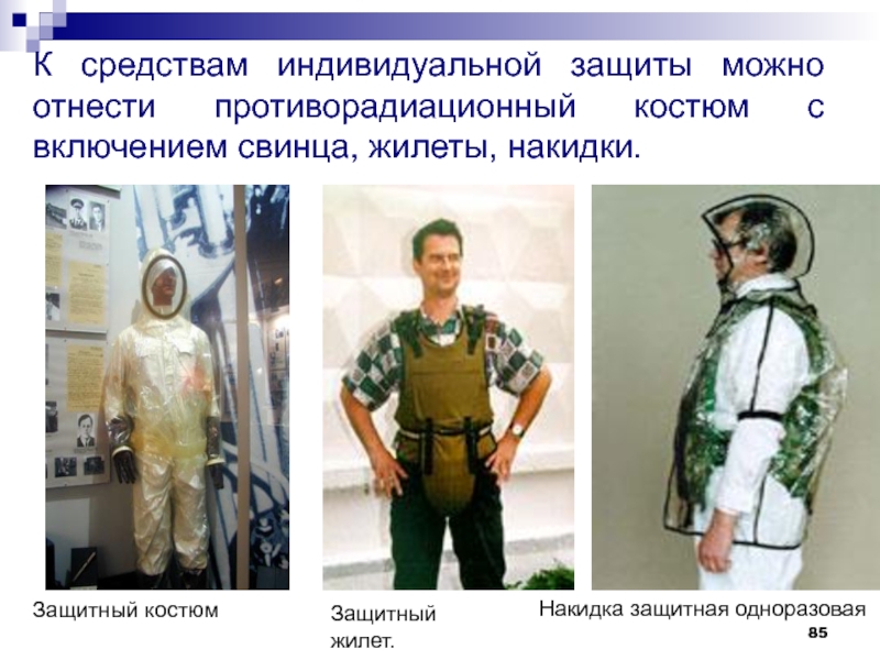 Слайд 85К средствам индивидуальной защиты можно отнести противорадиационный костюм с включением