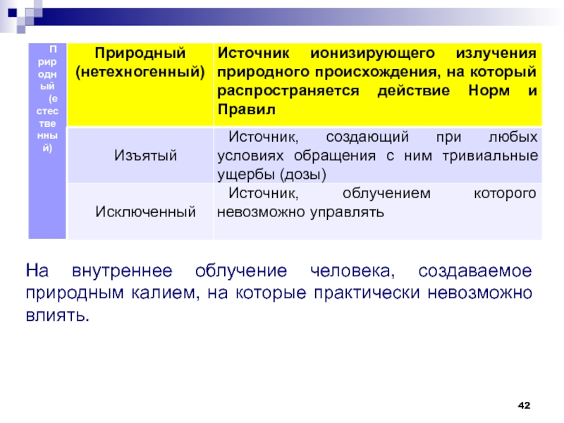 Слайд 42На внутреннее облучение человека, создаваемое природным калием, на которые практически
