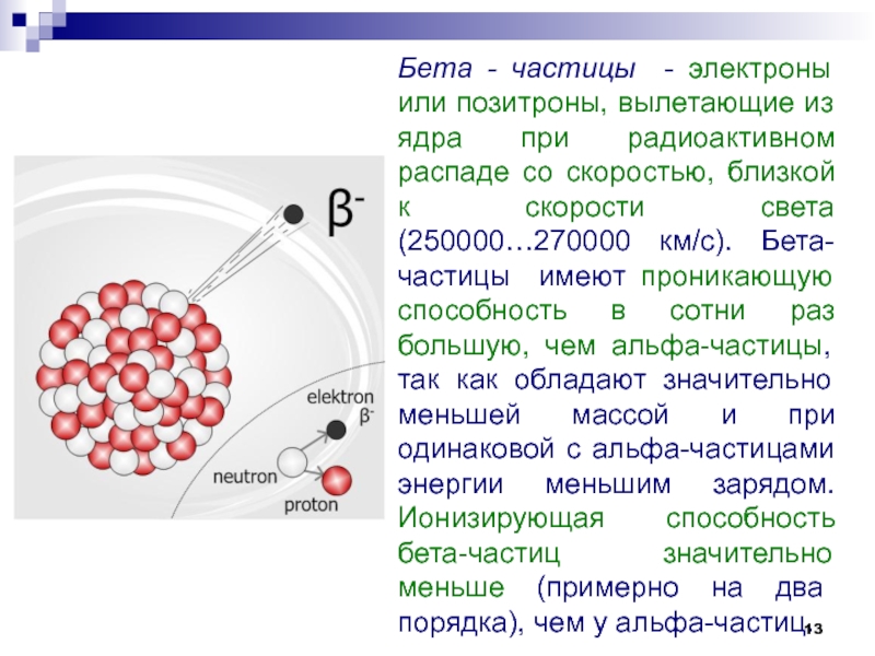 Слайд 13Бета - частицы - электроны или позитроны, вылетающие из ядра