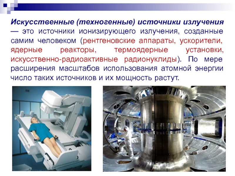 Слайд 29Искусственные (техногенные) источники излучения — это источники ионизирующего излучения, созданные