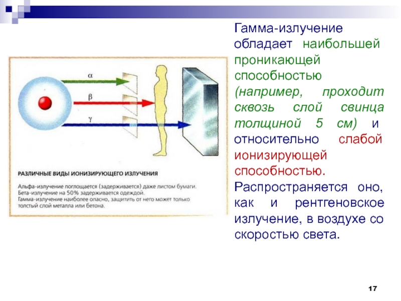Слайд 17Гамма-излучение обладает наибольшей проникающей способностью (например, проходит сквозь слой свинца
