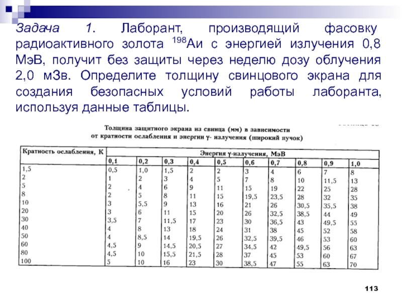 Слайд 113Задача 1. Лаборант, производящий фасовку радиоактивного золота 198Аи с энергией