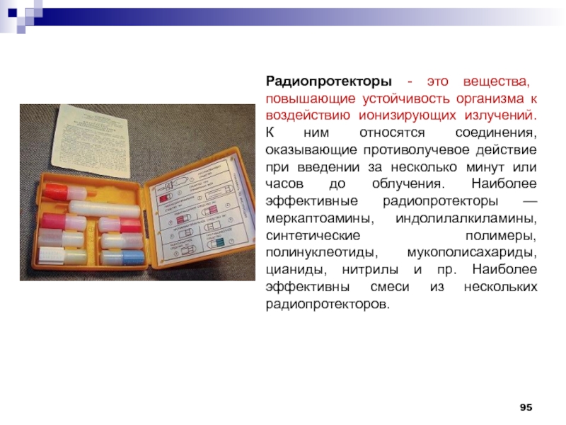 Слайд 95Радиопротекторы - это вещества, повышающие устойчивость организма к воздействию ионизирующих