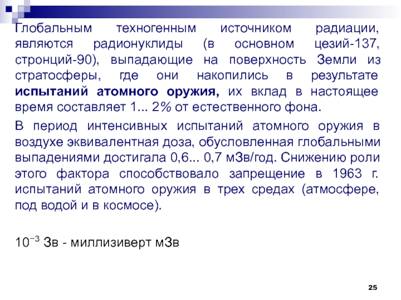 Слайд 25Глобальным техногенным источником радиации, являются радионуклиды (в основном цезий-137, стронций-90),
