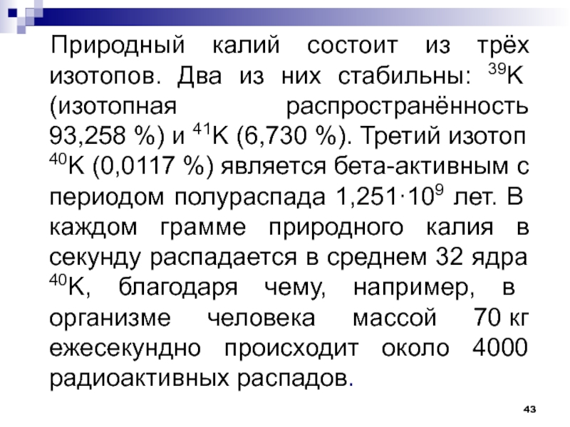 Слайд 43Природный калий состоит из трёх изотопов. Два из них стабильны: