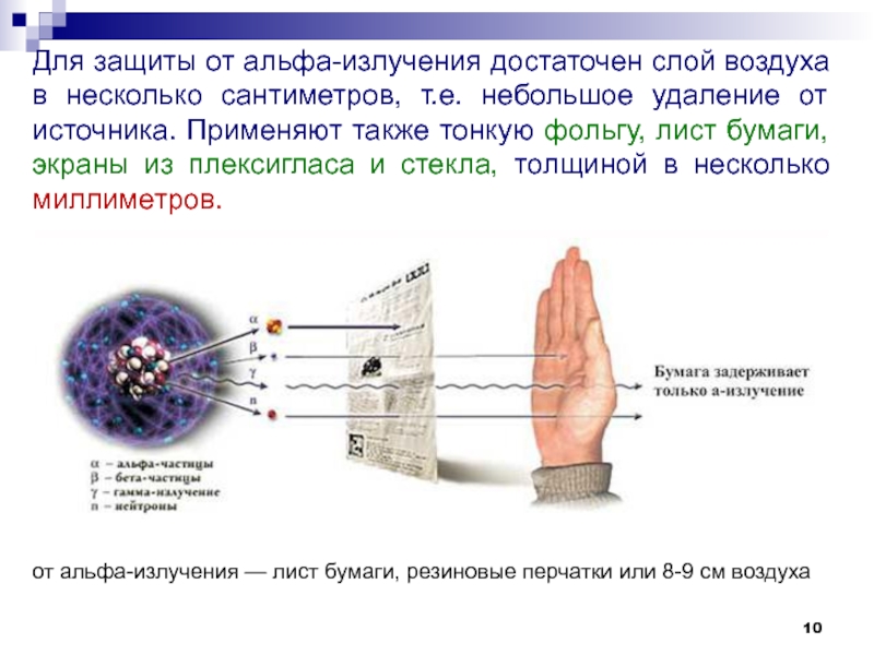 Слайд 10Для защиты от альфа-излучения достаточен слой воздуха в несколько сантиметров,