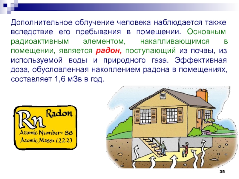 Слайд 35Дополнительное облучение человека наблюдается также вследствие его пребывания в помещении.