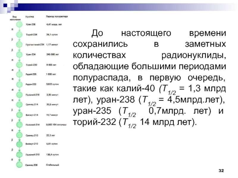 Слайд 32До настоящего времени сохранились в заметных количествах радионуклиды, обладающие большими