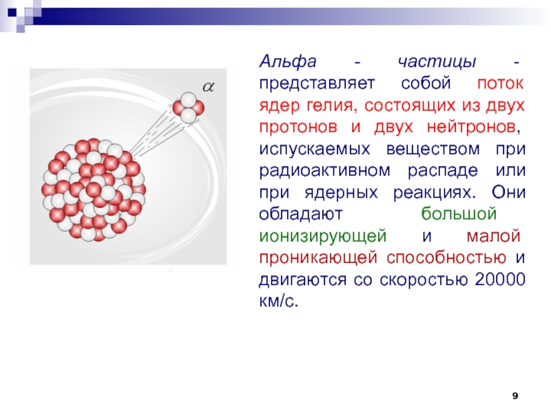 Слайд 9Альфа - частицы - представляет собой поток ядер гелия, состоящих