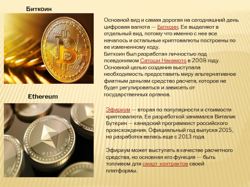Эфириум — вторая по популярности и стоимости криптовалюта. Ее разработкой занимался Виталик Бутерин — канадский программист российского происхождения. Официальный год выпуска 2015, но разработка велась еще с 2013 года.