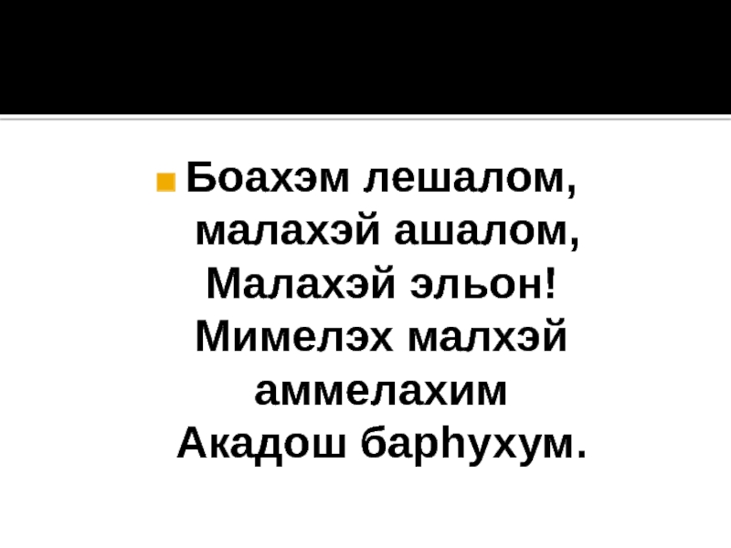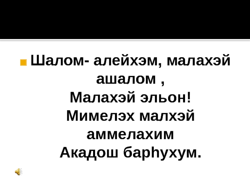 Слайд 7Шалом- алейхэм, малахэй ашалом , Малахэй эльон! Мимелэх малхэй аммелахим Акадош барhухум.