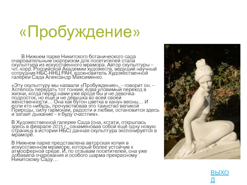 «Эту скульптуру мы назвали «Пробуждение», – говорит он. – Хотелось передать тот тонкий, едва уловимый переход в жизни, когда перед нами уже вроде бы и не девочка-подросток, но ещё и не девушка во всей своей женственности… Она как бутон цветка в канун весны… И если кто-нибудь, прочувствовав это таинство великой Природы, силу гармонии, радости и любви, остановится здесь и затаит дыхание – я буду счастлив».