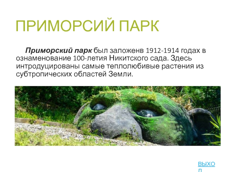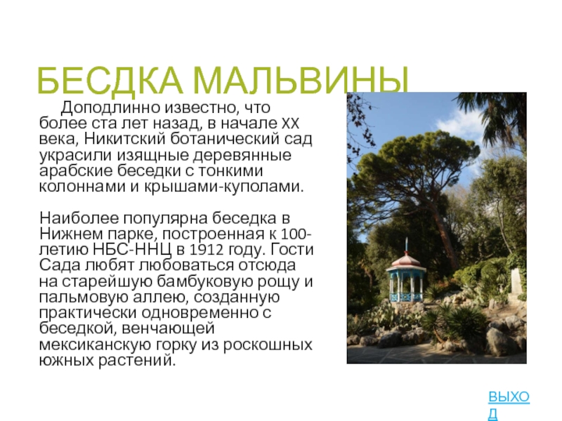 В Художественной галерее Сада (она, кстати, открылась здесь в феврале 2015 г., ознаменовав собой ещё одну новую страницу в истории НБС) данная скульптура экспонируется в мраморе.